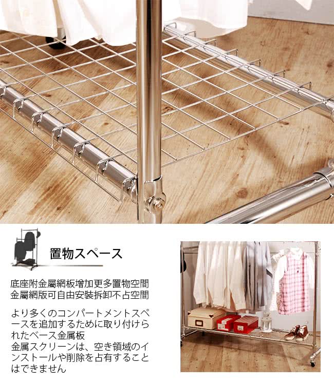 耐重度佳,高承載80公斤,耐重工業輪設計,具安全剎車功能且承重能力強,輕鬆移動好整理,居家或商業場合皆適用,採旋鈕式的配件,不傷害鐵管。吊衣桿高低可自由延伸62.5公分、高度從117.5180 cm自由調整,可吊掛大衣、風衣、外套、褲裙、襯衫隨心所欲,冬衣夏服輕鬆收納,底座附金屬網版,增加更多置物空間、可擺放包包、收納箱、鞋子...等。雙桿兩側富活動掛鉤可吊皮帶、圍巾、帽子、折傘...等。
